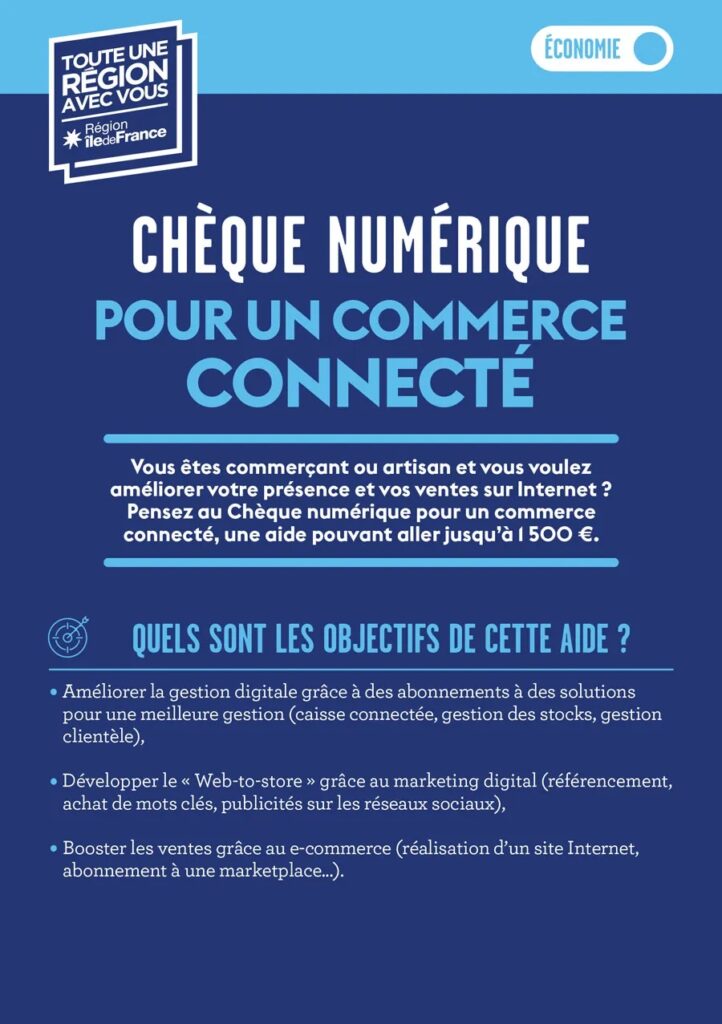 La Région Île-de-France propose le Chèque Numérique, une aide financière pouvant aller jusqu’à 1 500 €, destinée aux artisans et commerçants de proximité de moins de 10 salariés.
